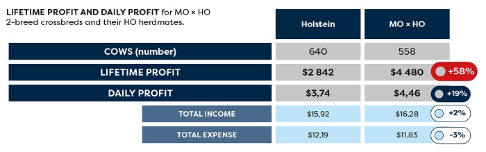 +8% MORE FEED EFFICIENTThe crossbred cows MO x HO are more productive in comparison to the pure Holsteins. +0.9% FAT & PROTEIN, lower DRYMATTER INTAKE -6.5% for the crobred cows, better BODY CONDITION SCORE +0.19 for the MOxHO. Fat & Protein / DMI : 0.12 for Holstein and 0.13 for MOx HO, it means +8% Feed efficiency
